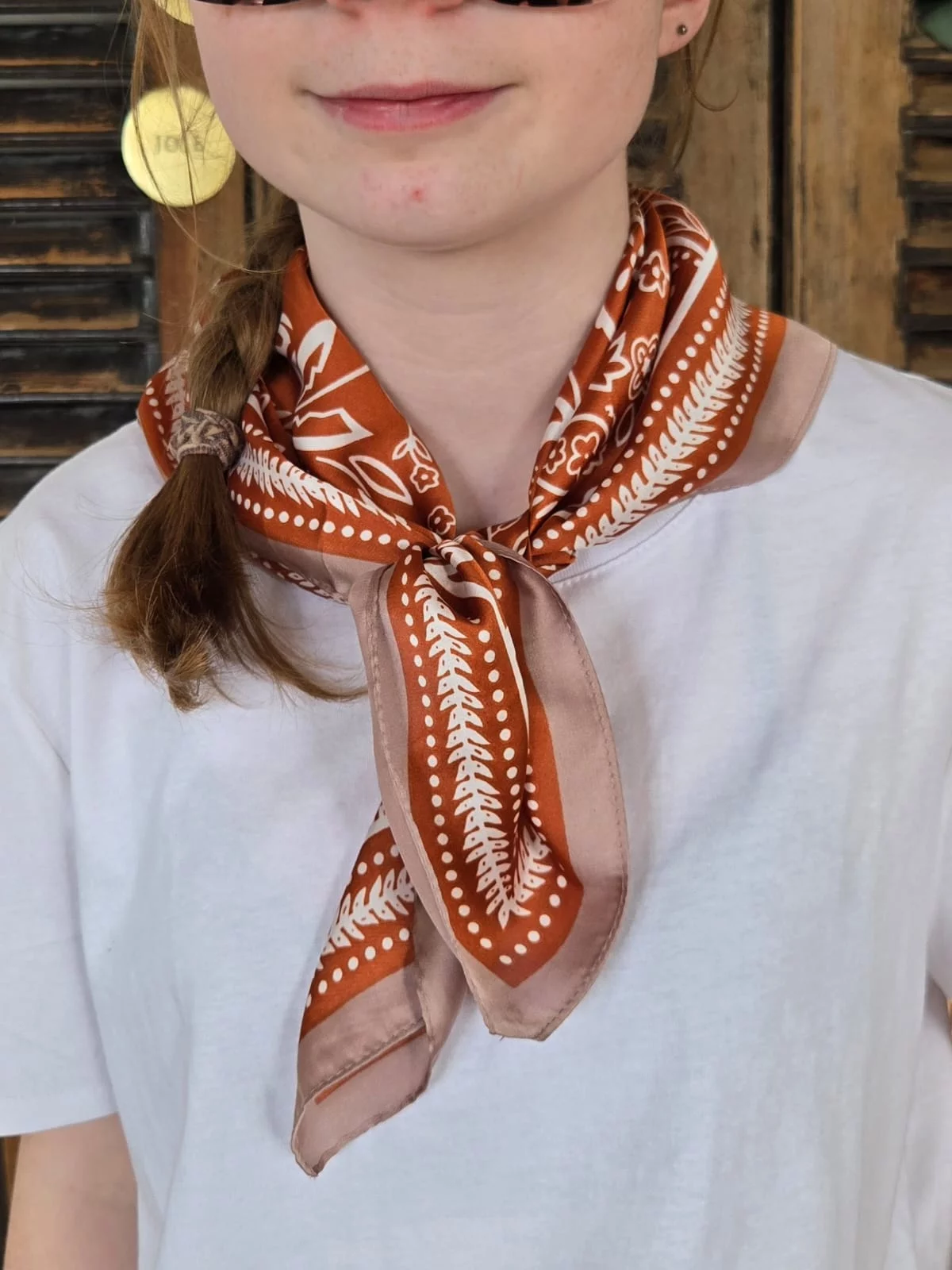 Foulard carré soyeux motif cachemire rouille