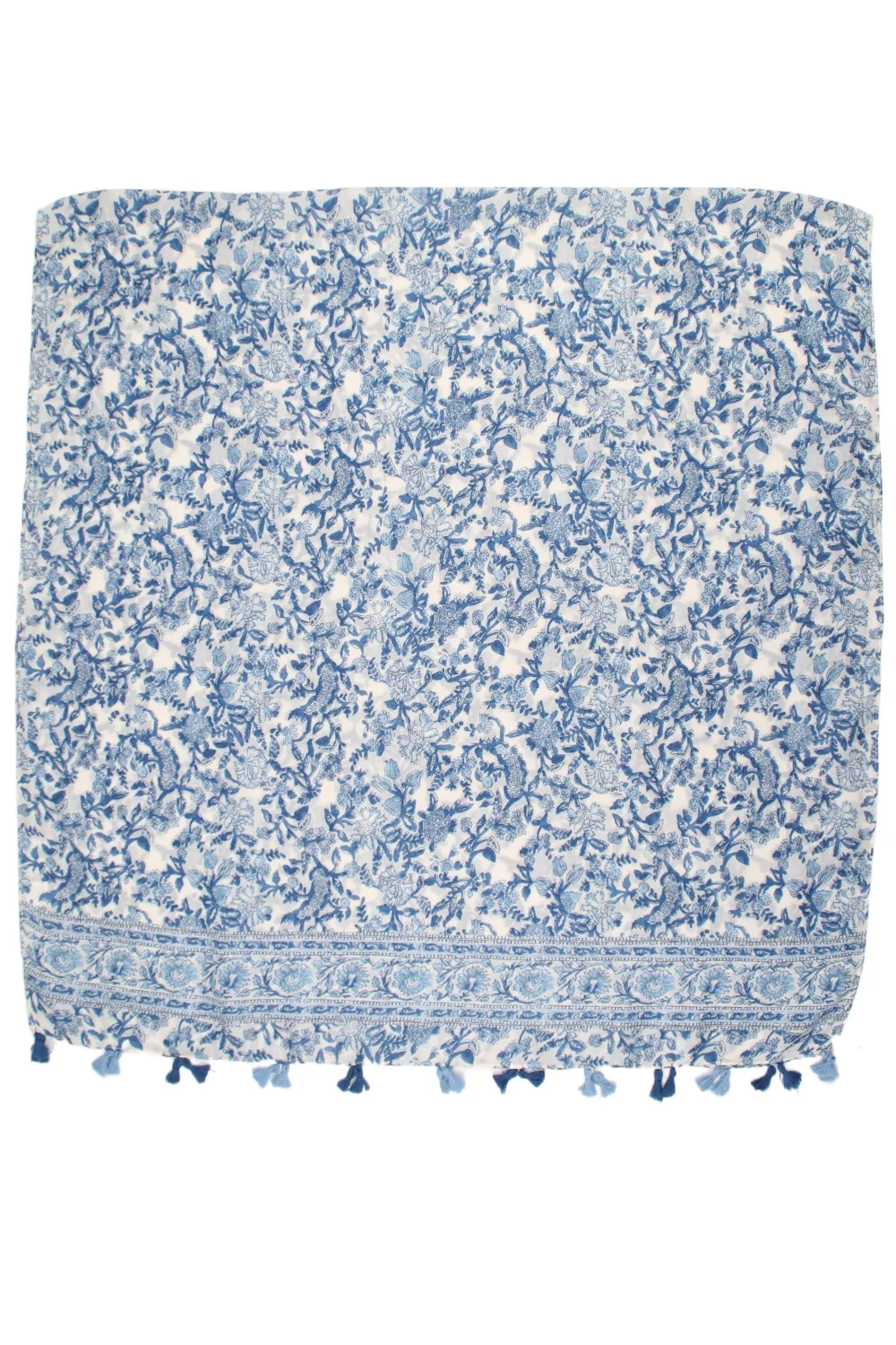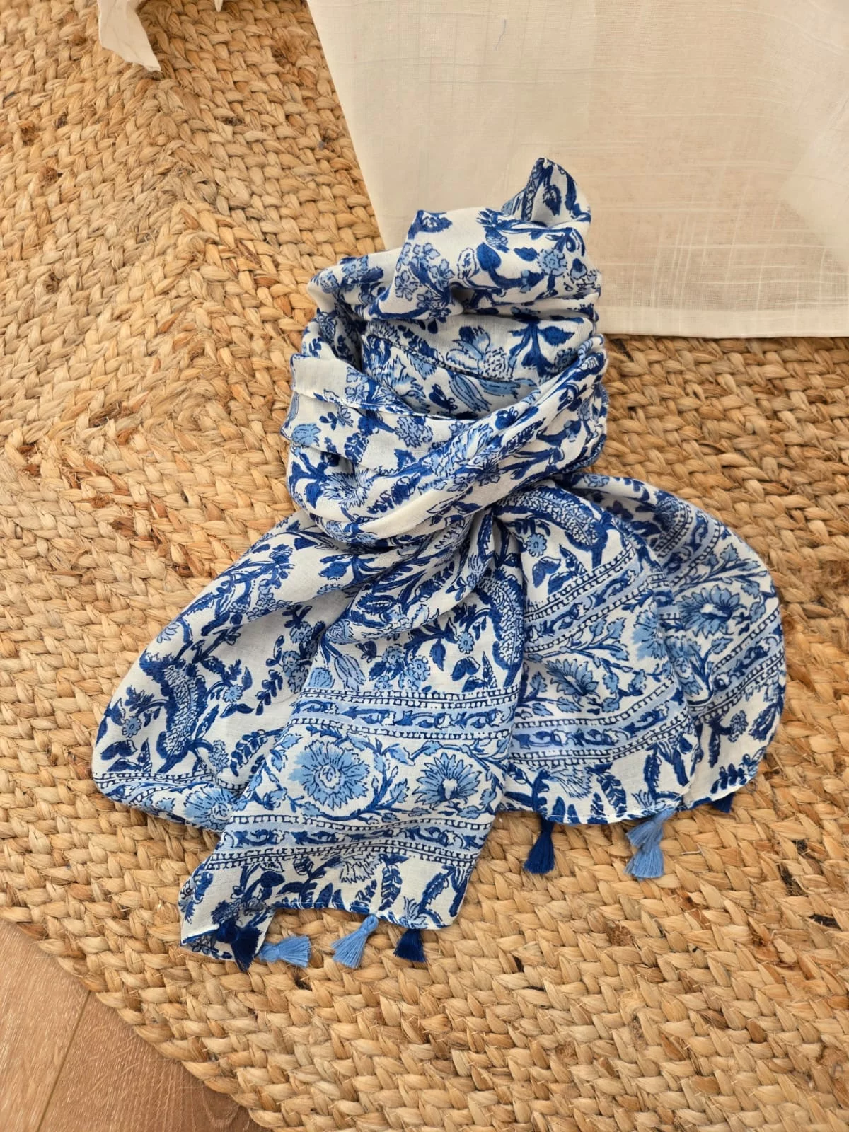 Foulard fleurs bleu pompons