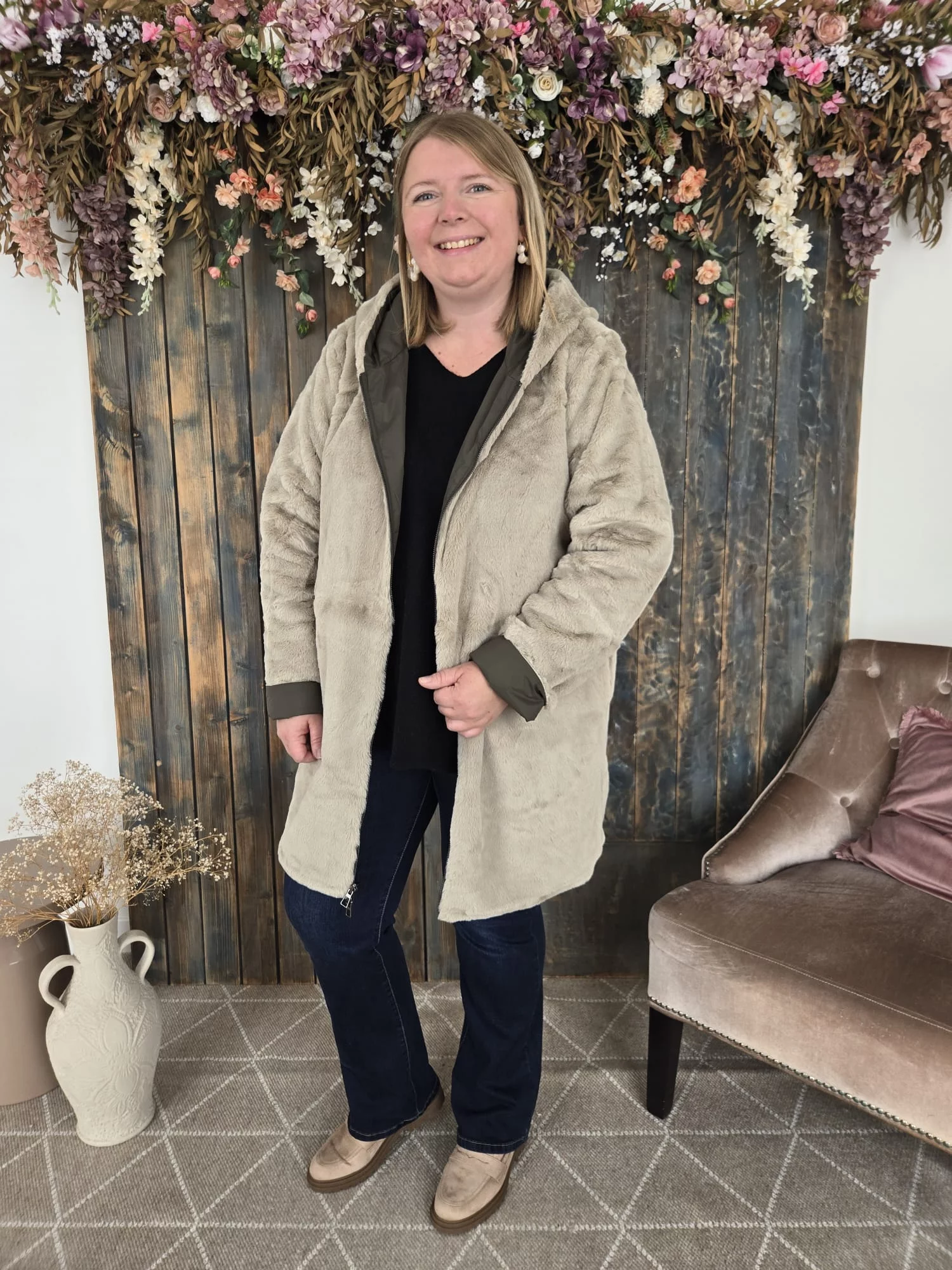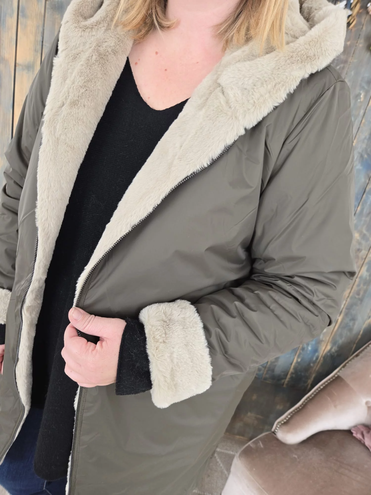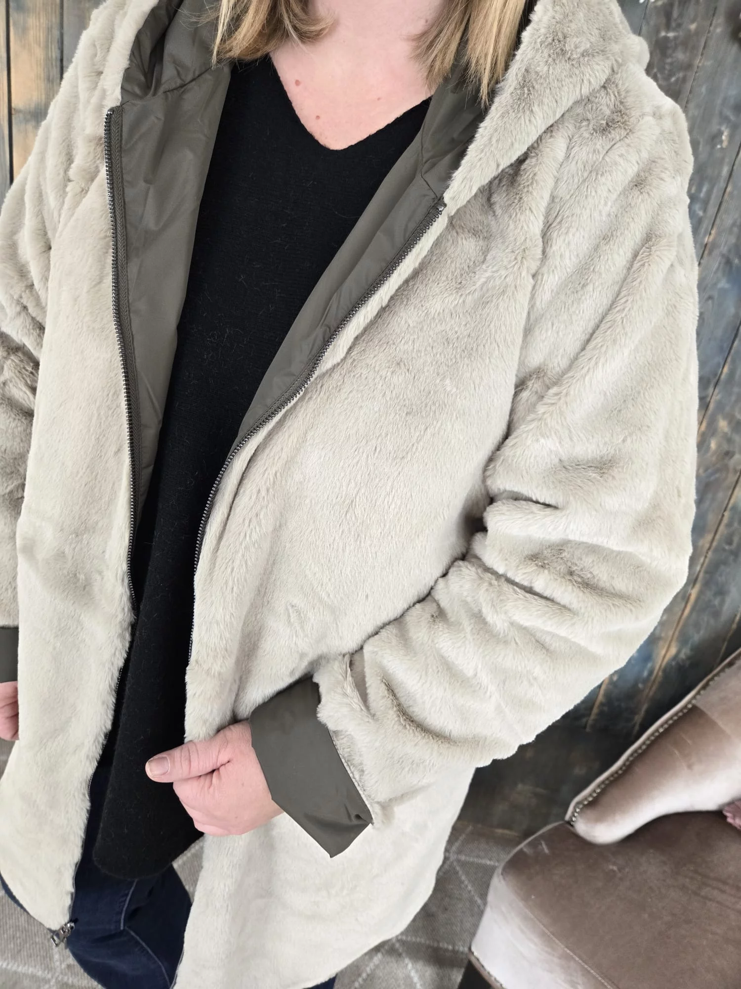 • Un coté en fausse fourrure beige toute douce