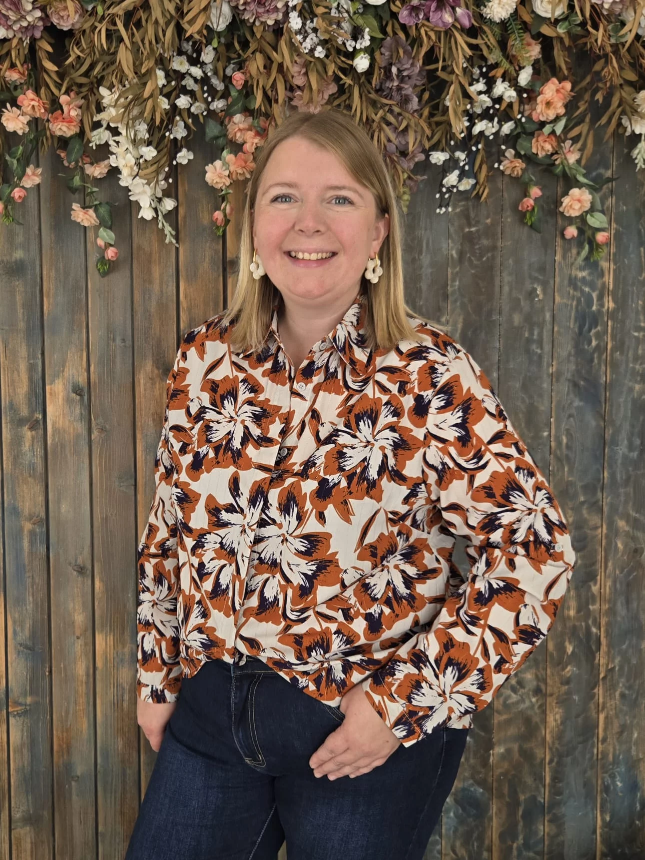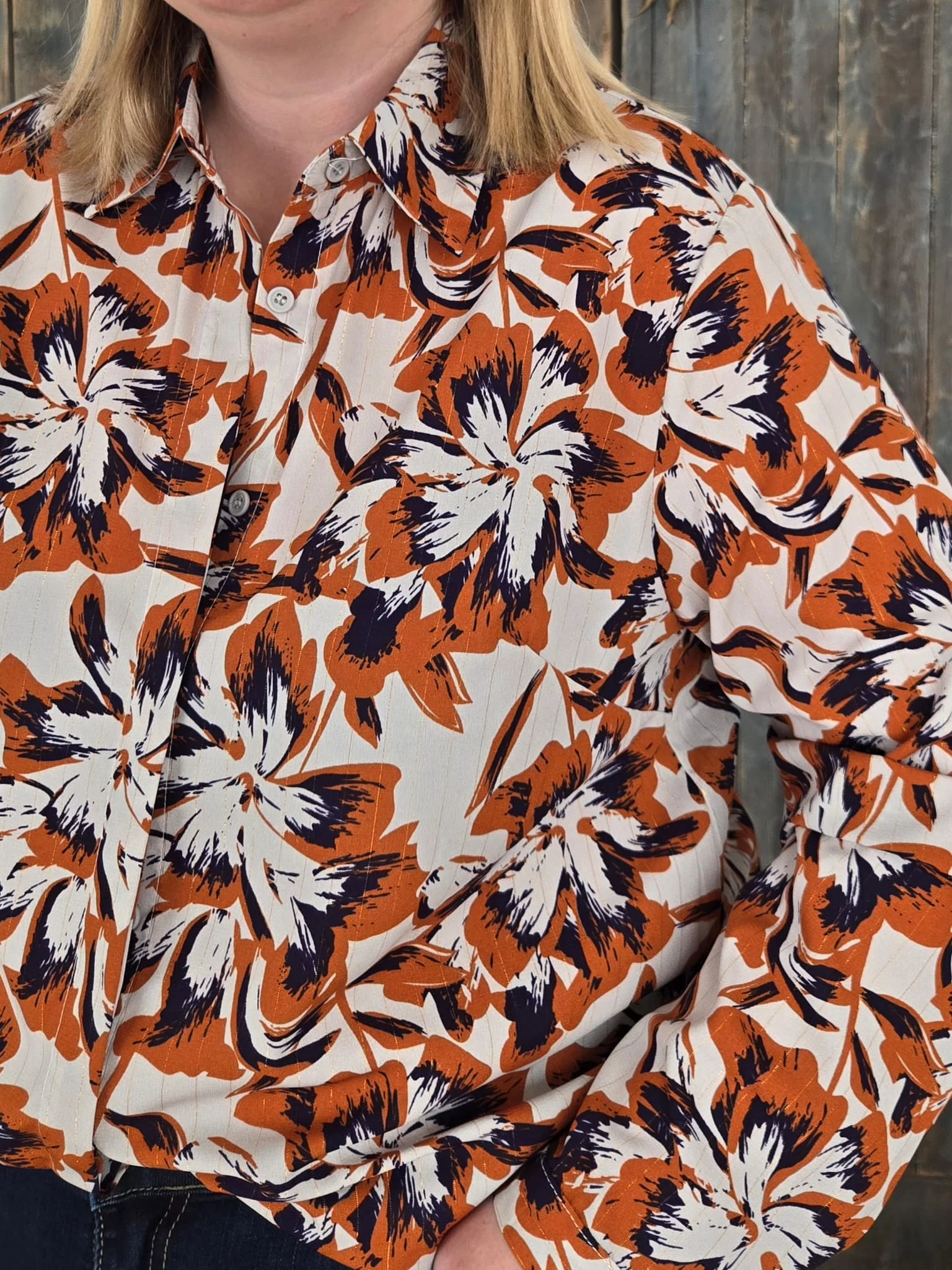 • Imprimé fleurs dans les teintes de rouille et bleu marine sur un fond beige