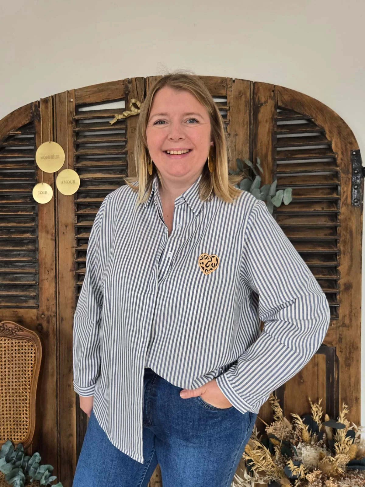 • Rayée bleu et blanc avec cœur tissu léopard sur la poitrine
