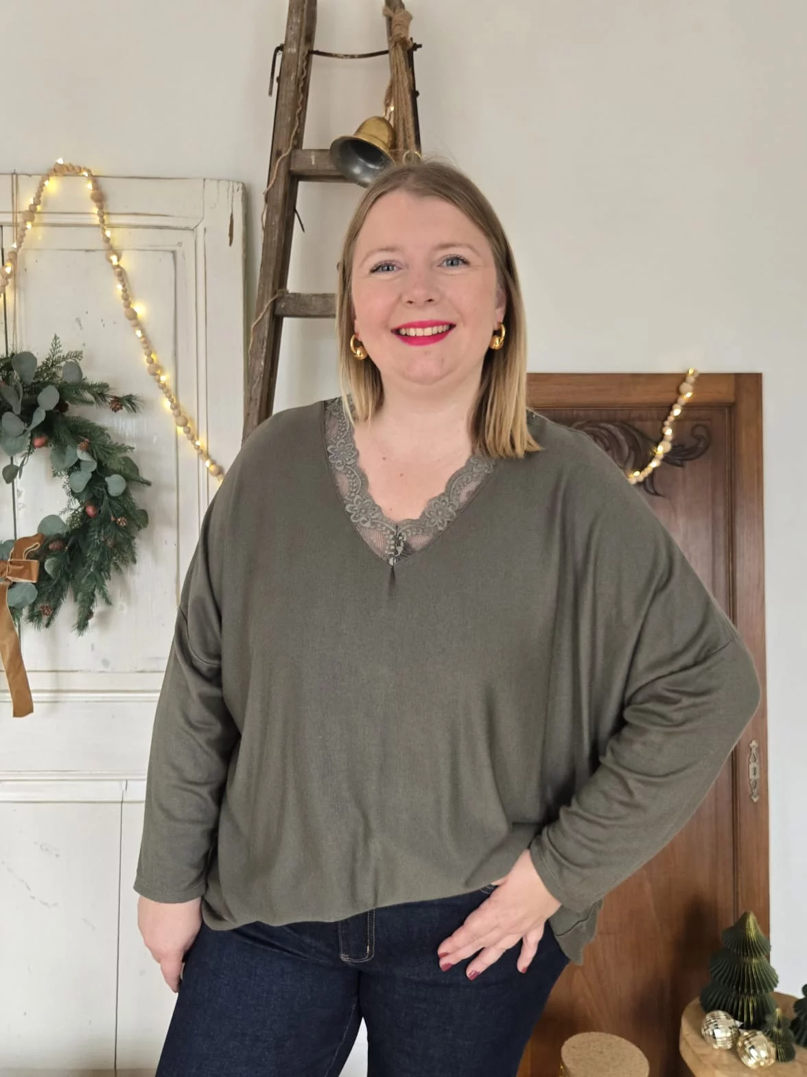 Pull fin col V dentelle kaki