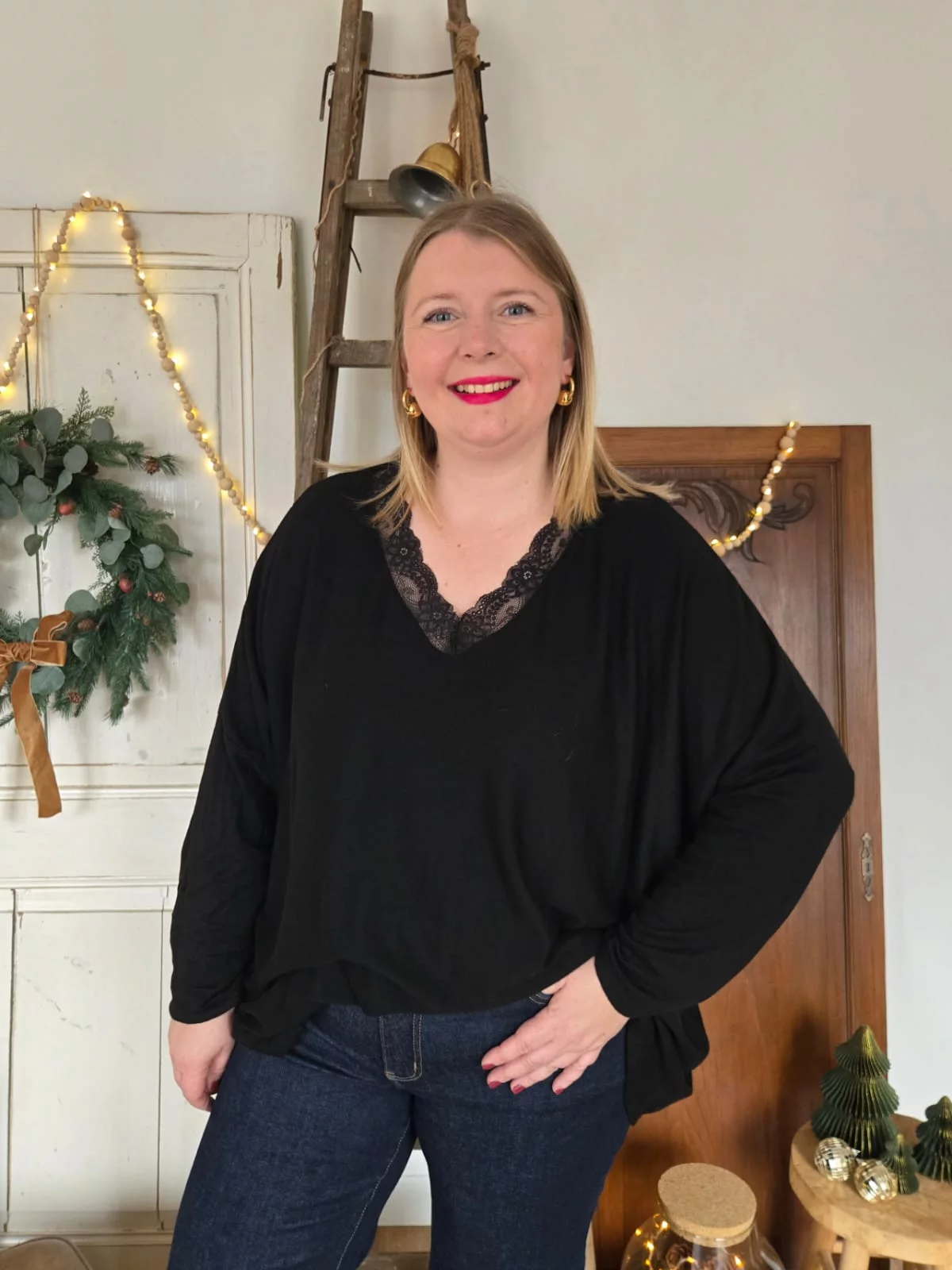 Pull fin col V dentelle noir