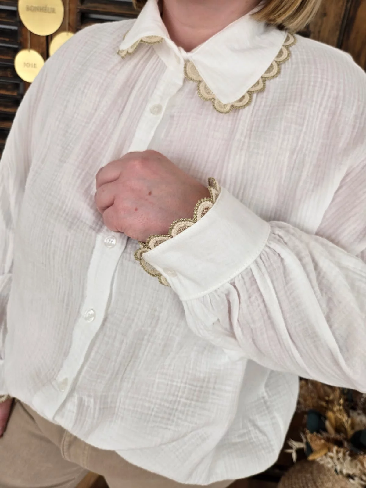 Chemise Justine gaze coton blanc biais doré