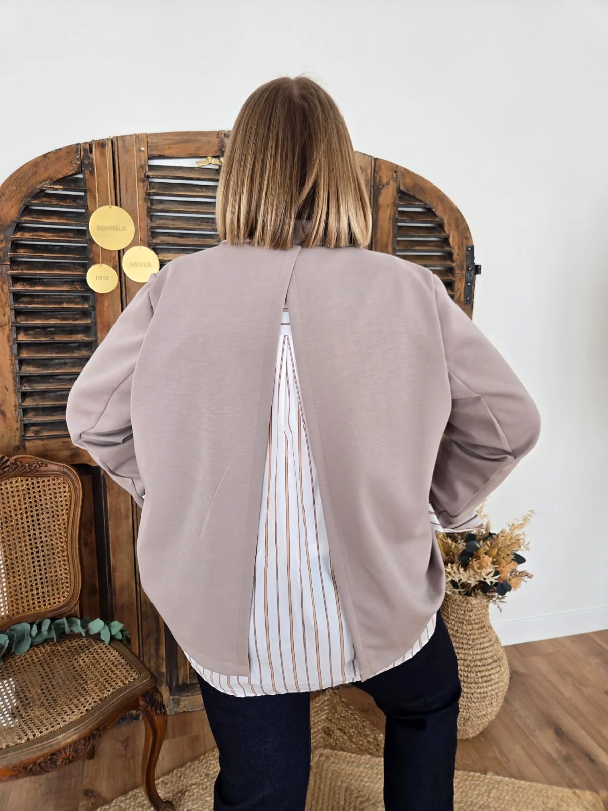 • Effet superposition dessous chemise aux bas des manches et dans le dos ouvert