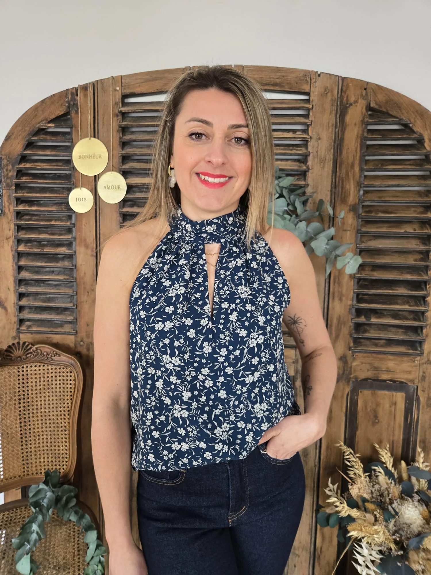 Blouse Marion bleu fleurie sans manches