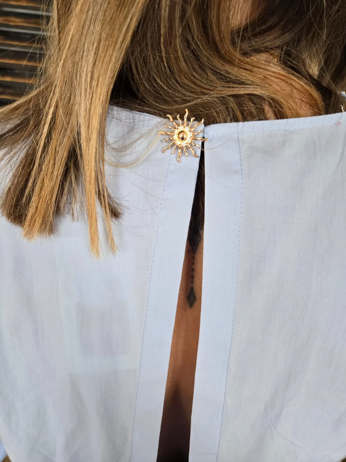 • Bouton bijoux soleil doré dans la nuque