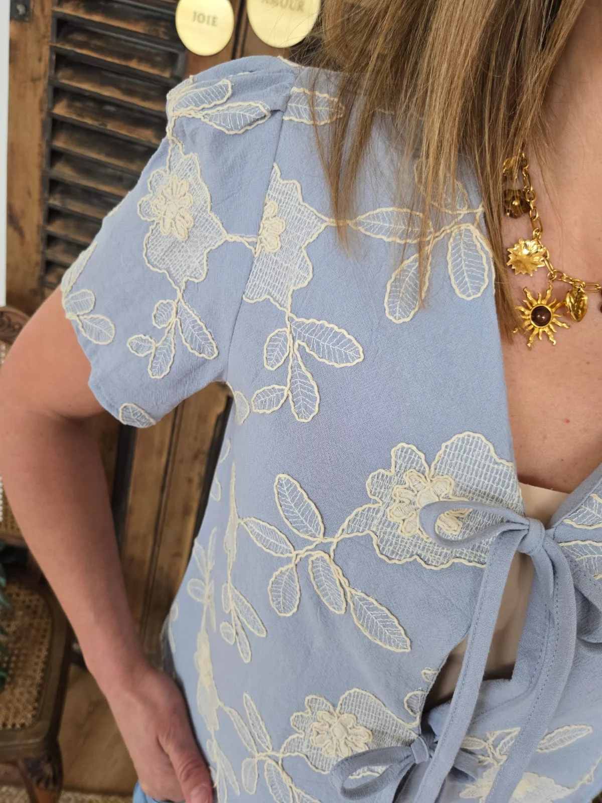 Blouse Lilou bleu ciel fleurs brodées