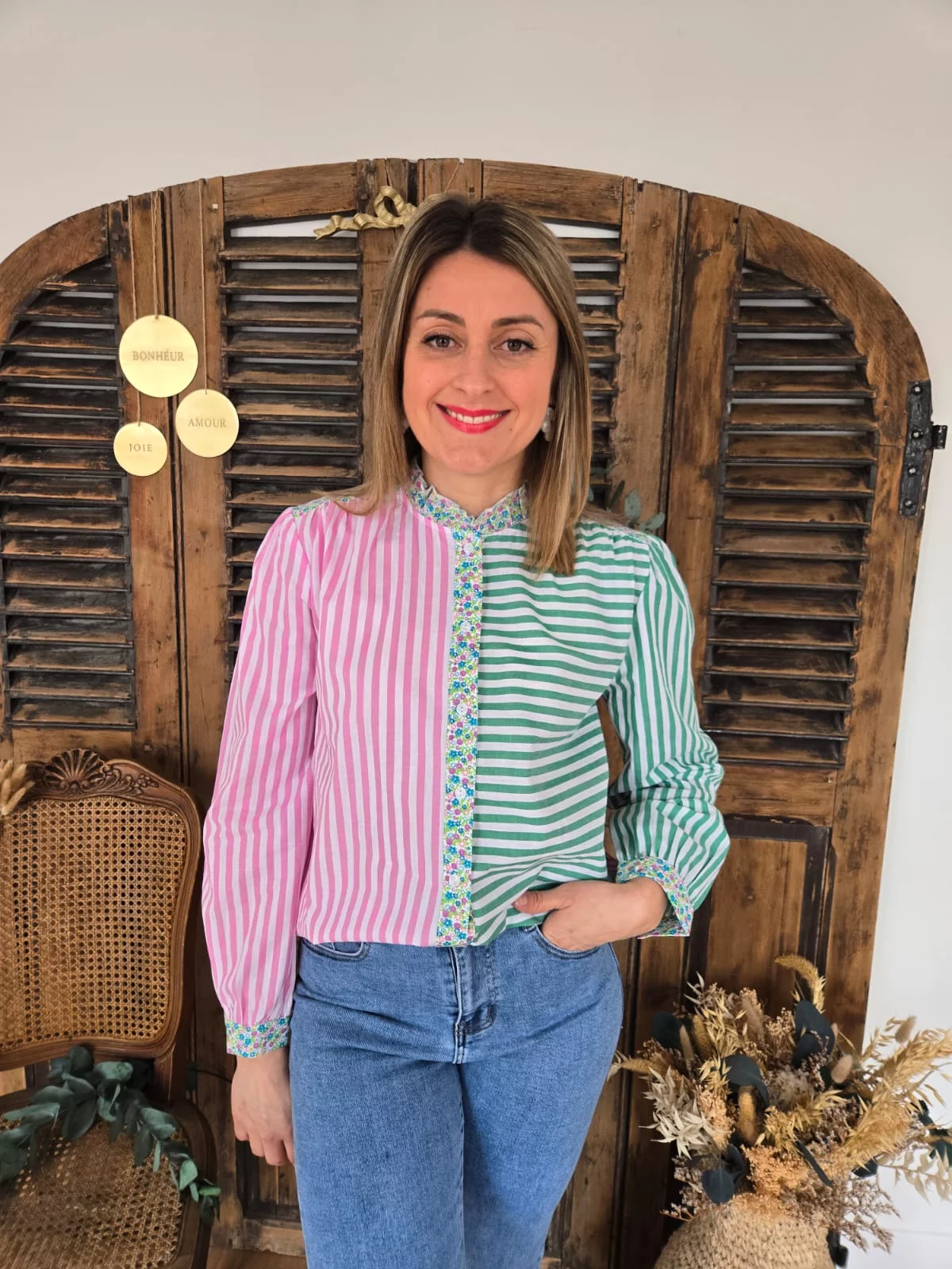 Chemise rose et vert patchwork rayé et fleuri