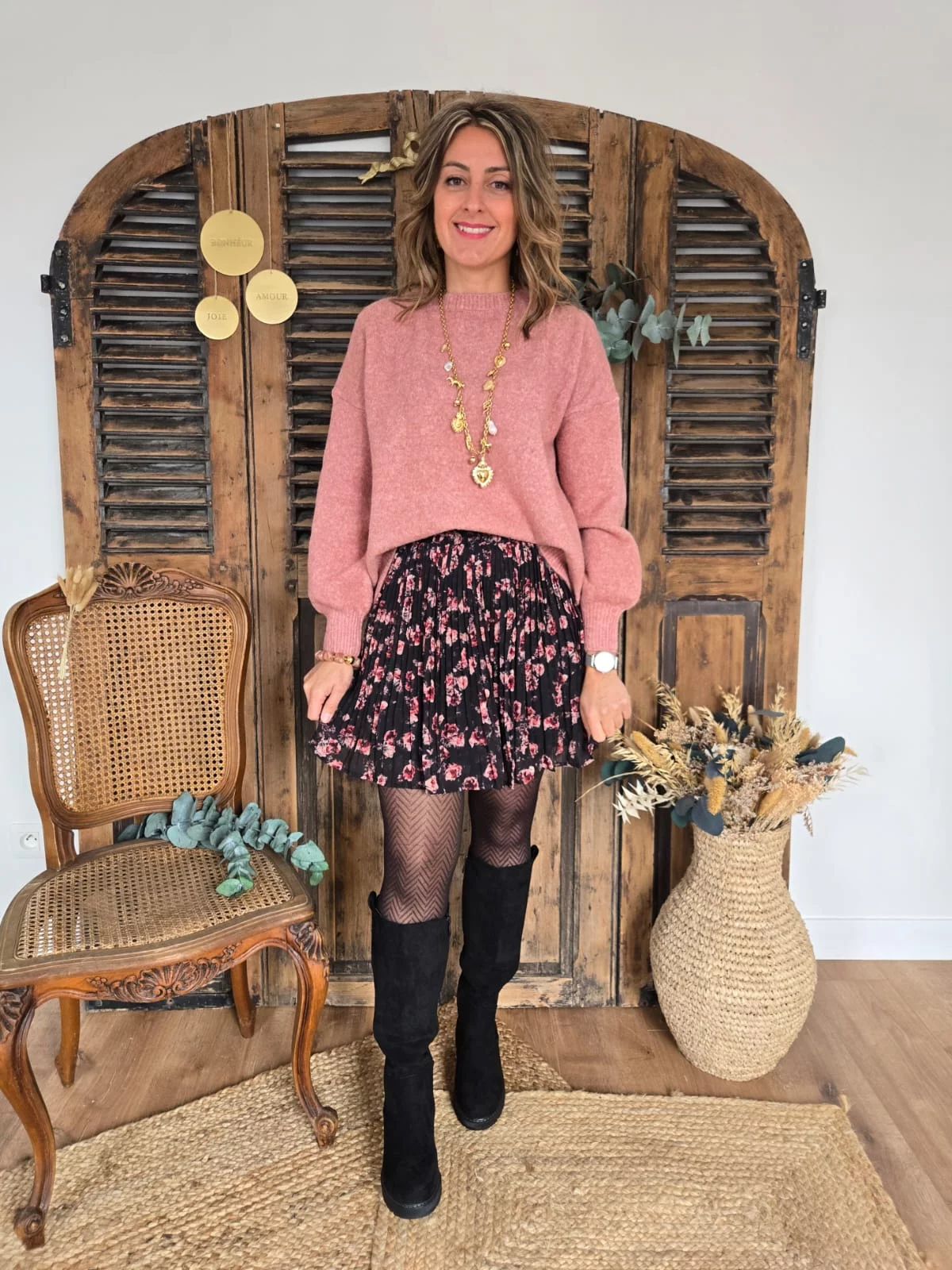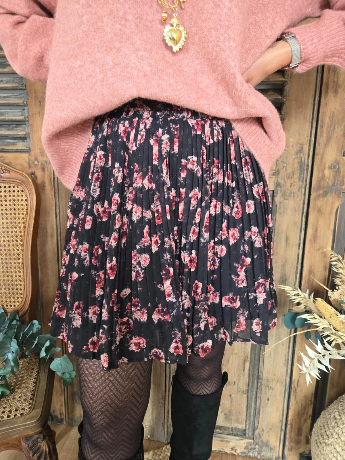 • Jupe noir motif fleurs vieux rose / bordeaux