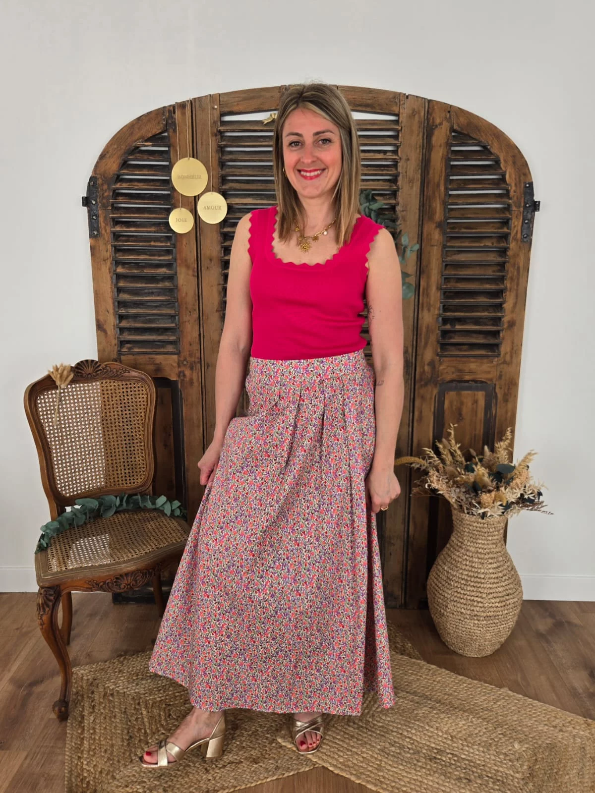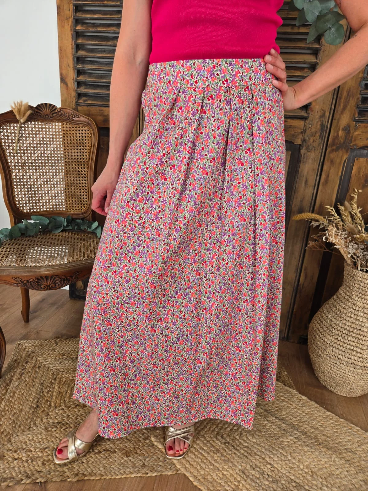 • Motif petites fleurs dans les teintes fuchsia, violet, vert avec une touche de bleu