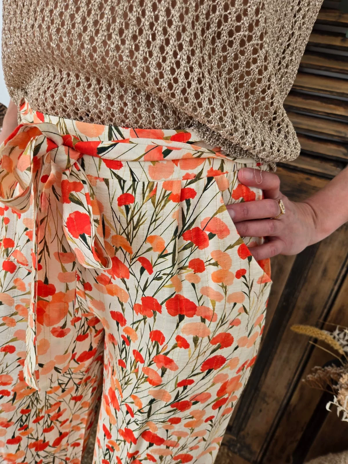 • Beige avec motifs fleurs coquelicots corail / orange, détails fin fil lurex