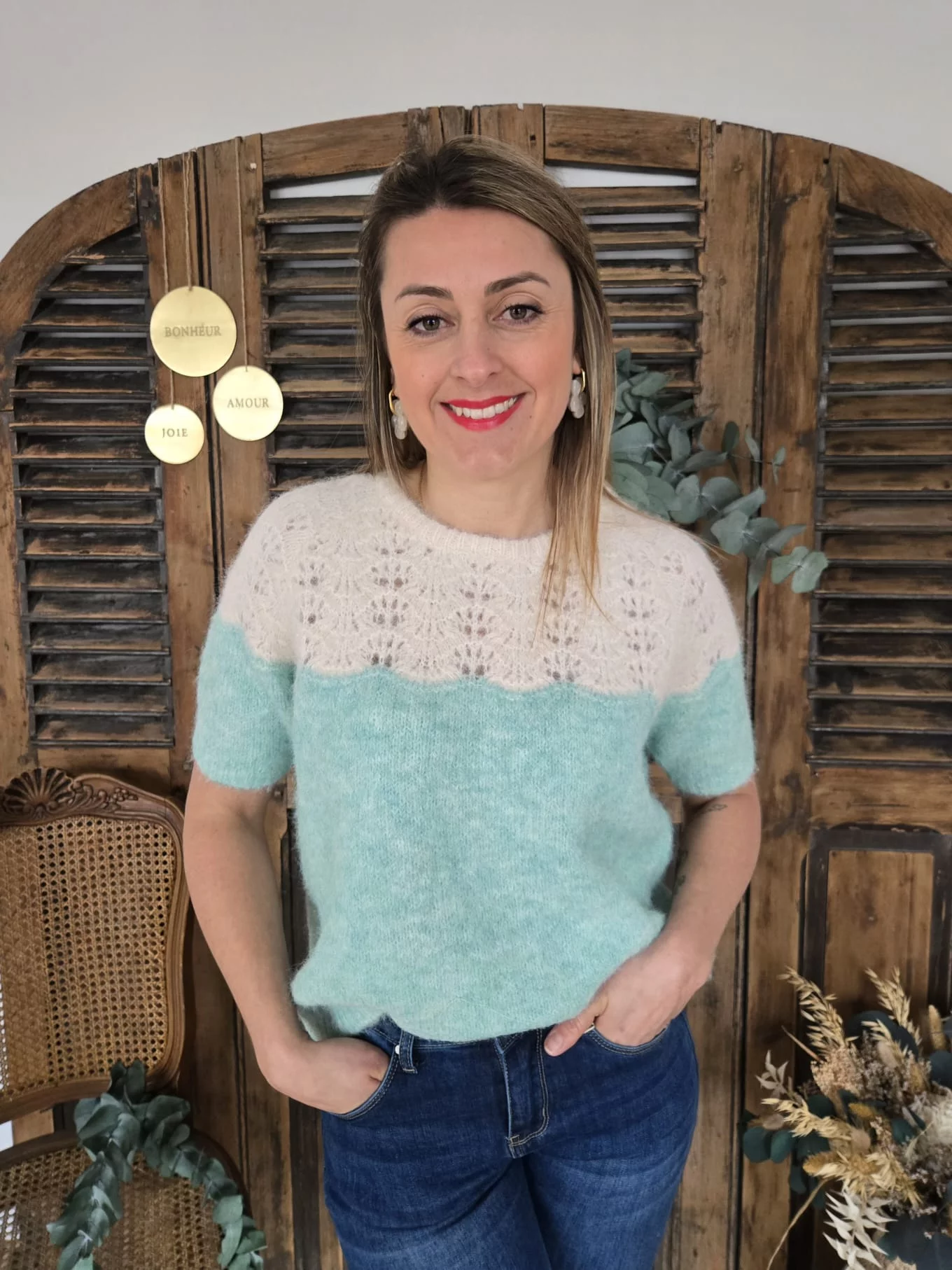 • Le haut beige est en maille ajourée