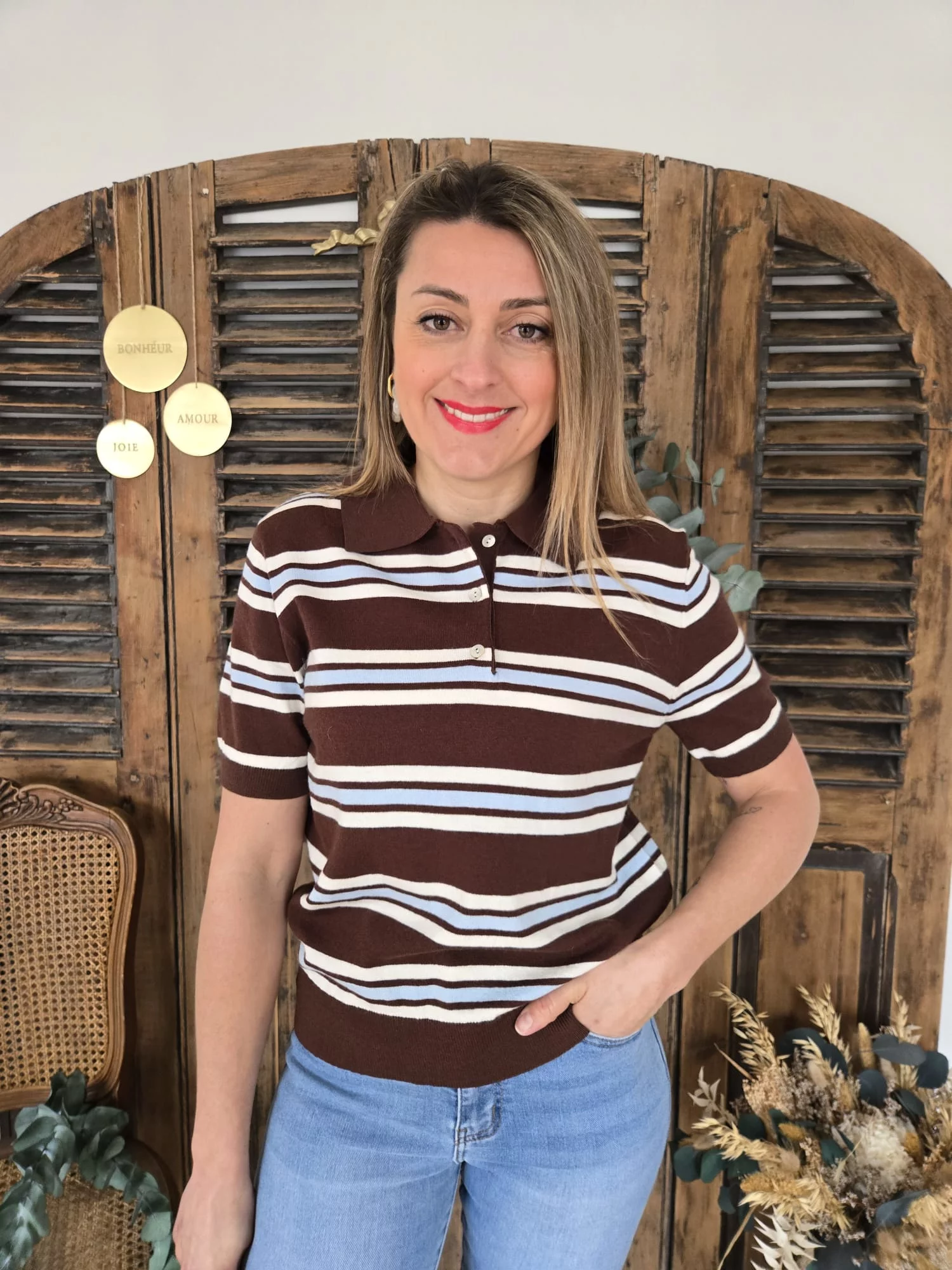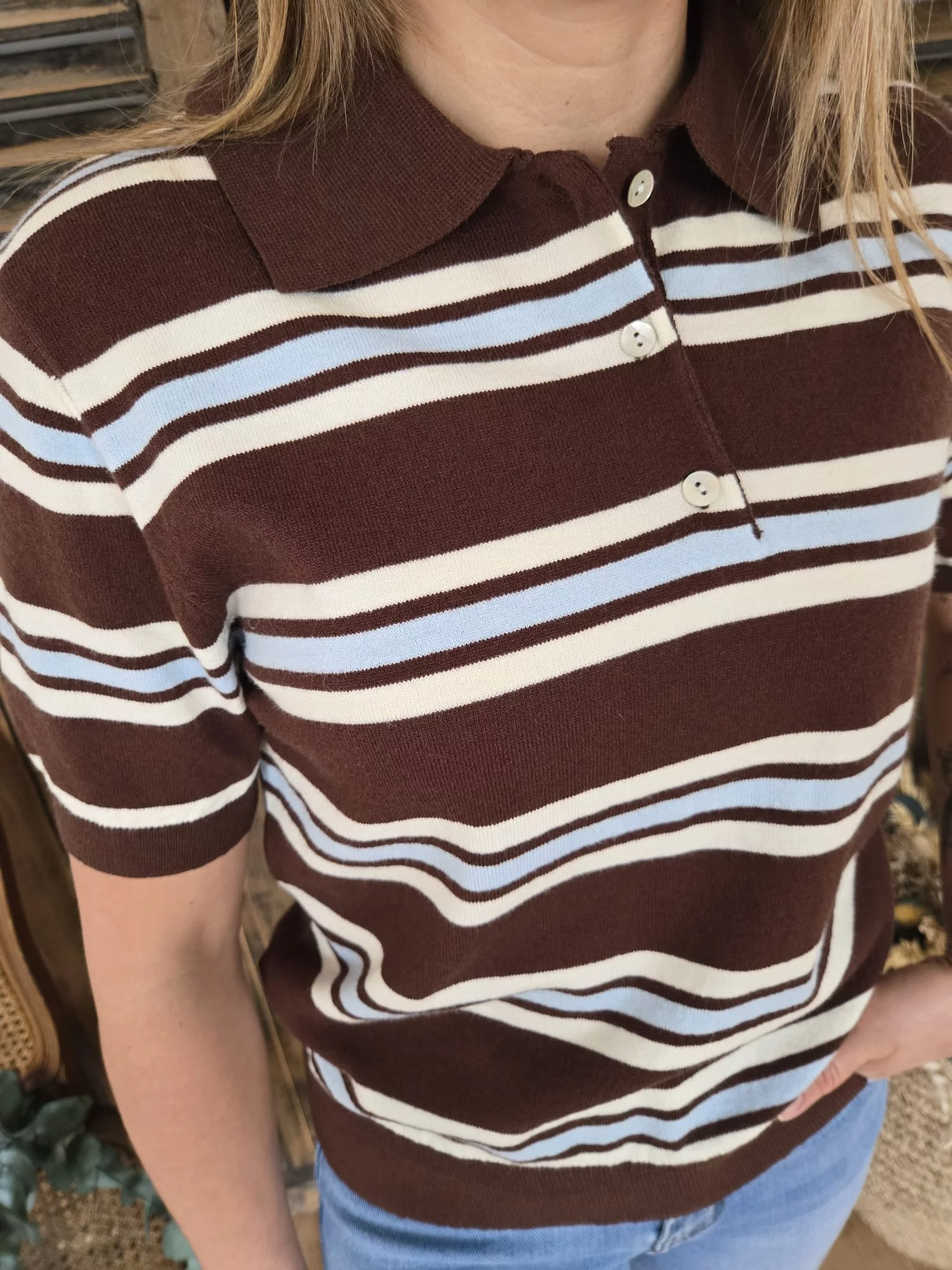 Pull polo chocolat rayé Leo
