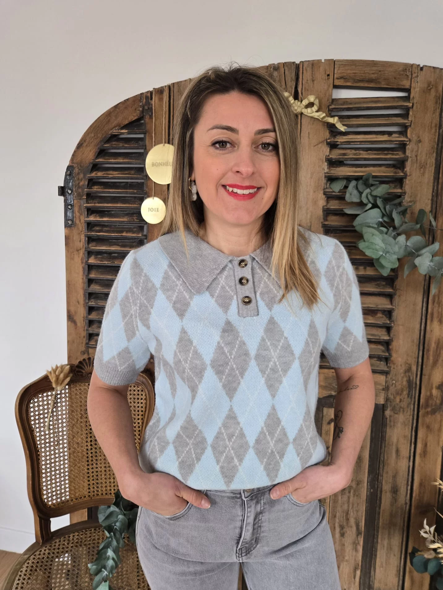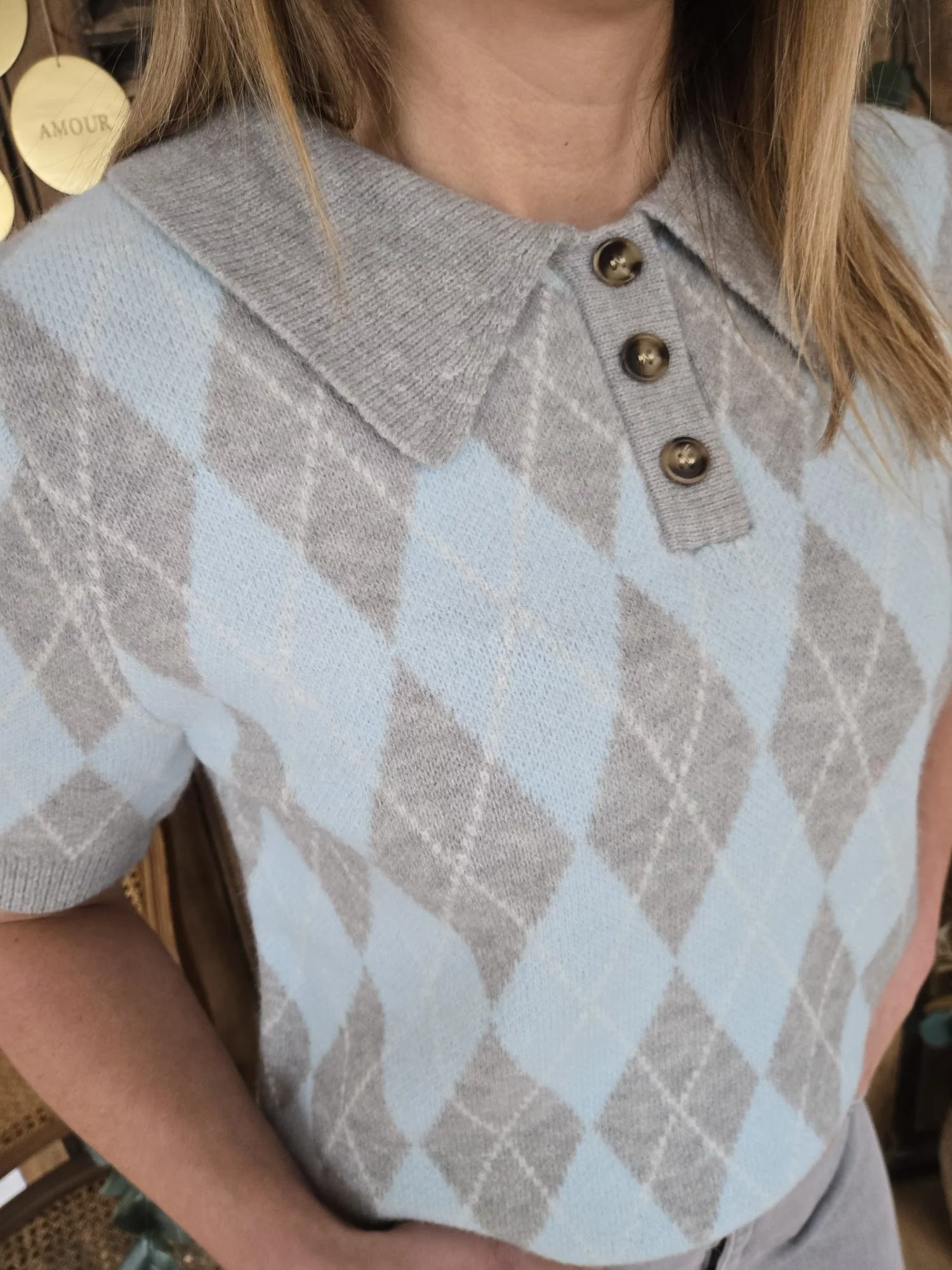 • En tricot losange gris et bleu ciel