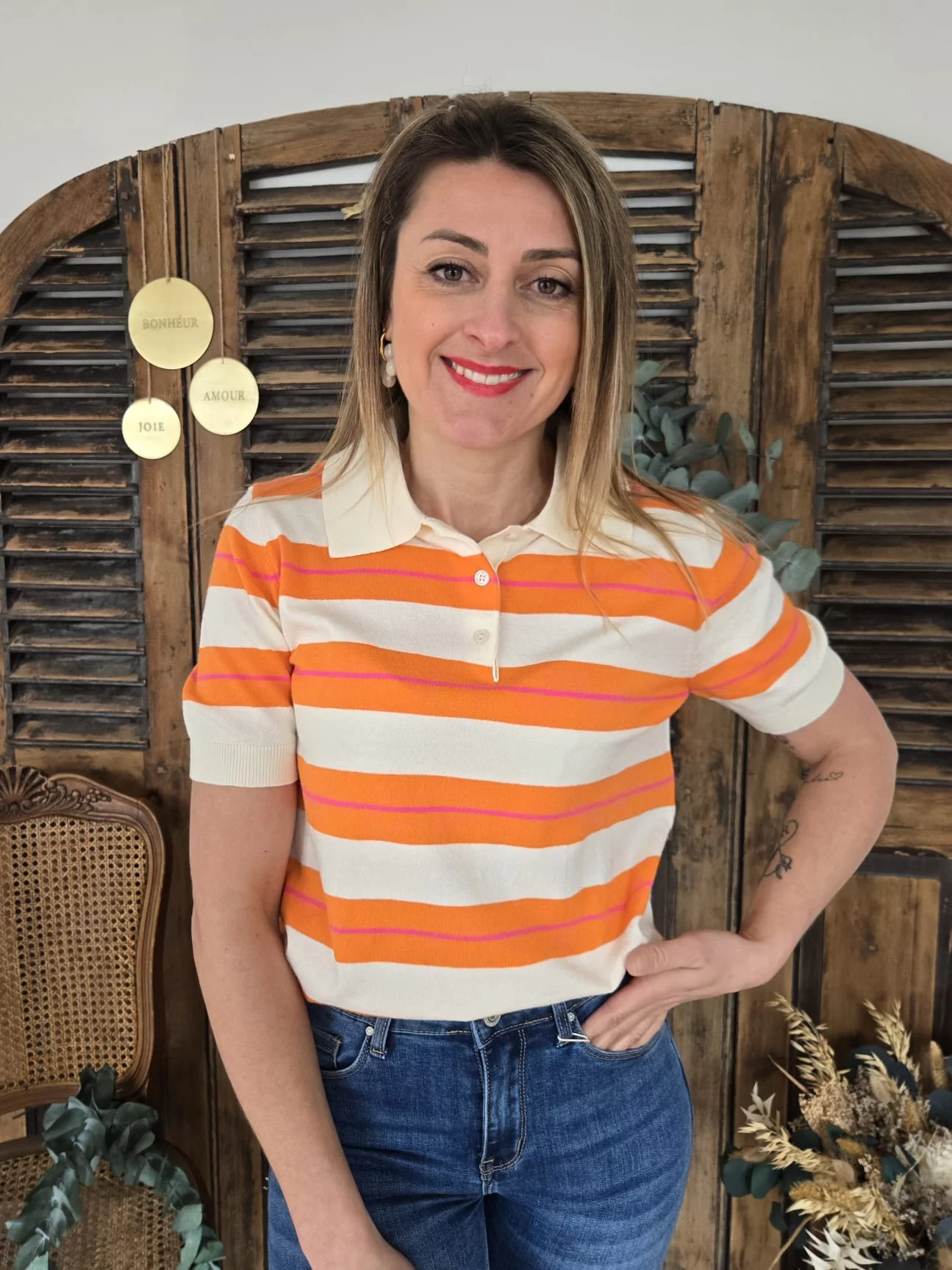 • Rayé beige, orange et fuchsia