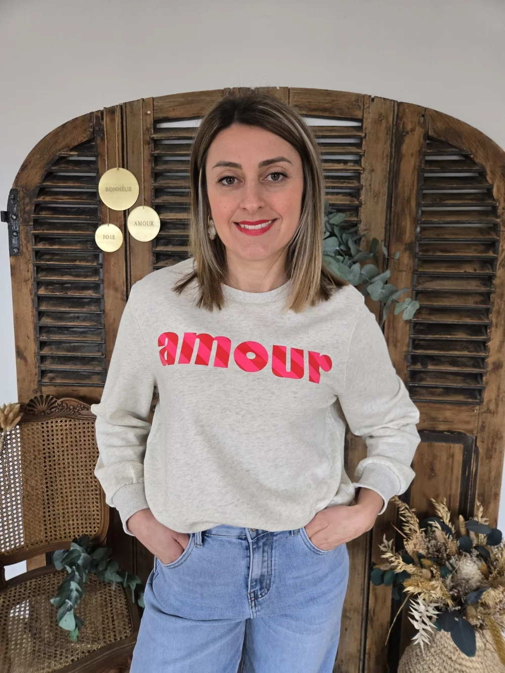 Sweat beige chiné Amour rose