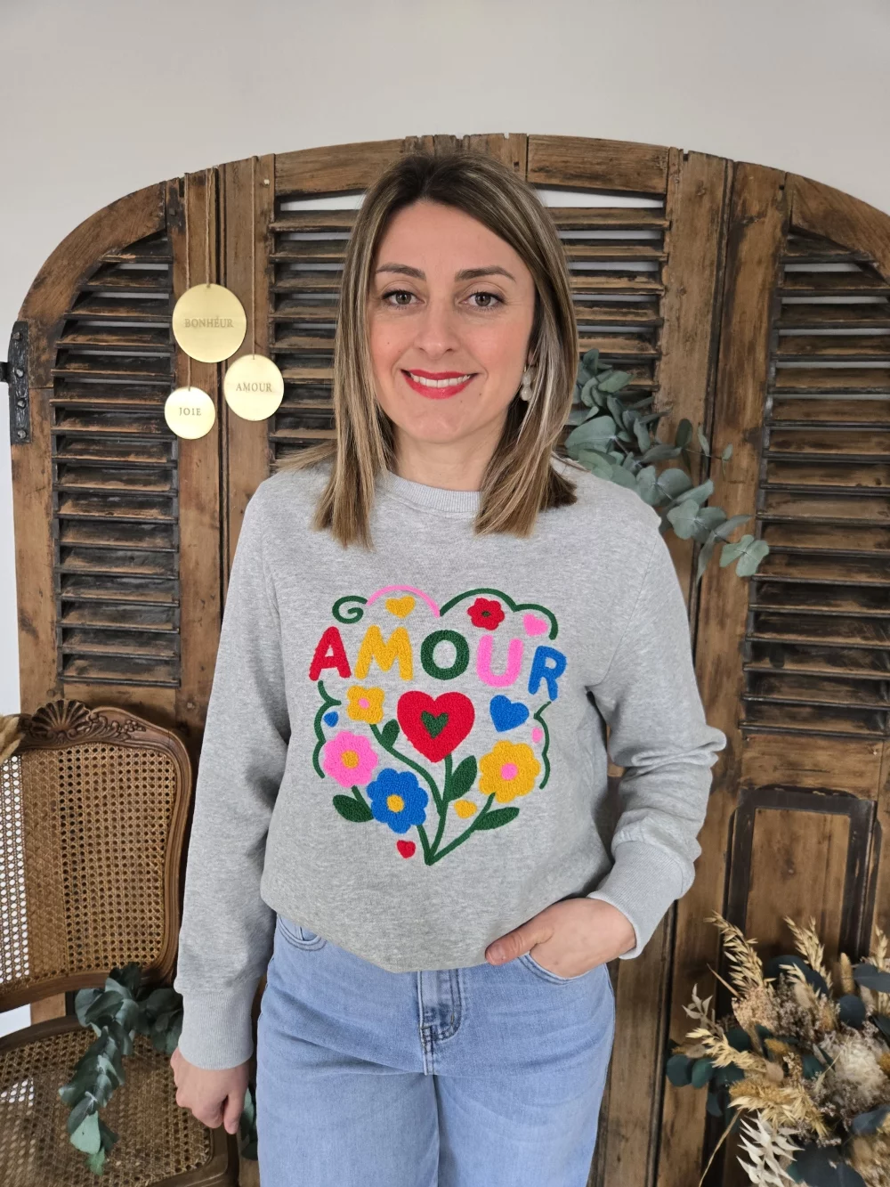 Sweat gris Amour et fleurs bouclette