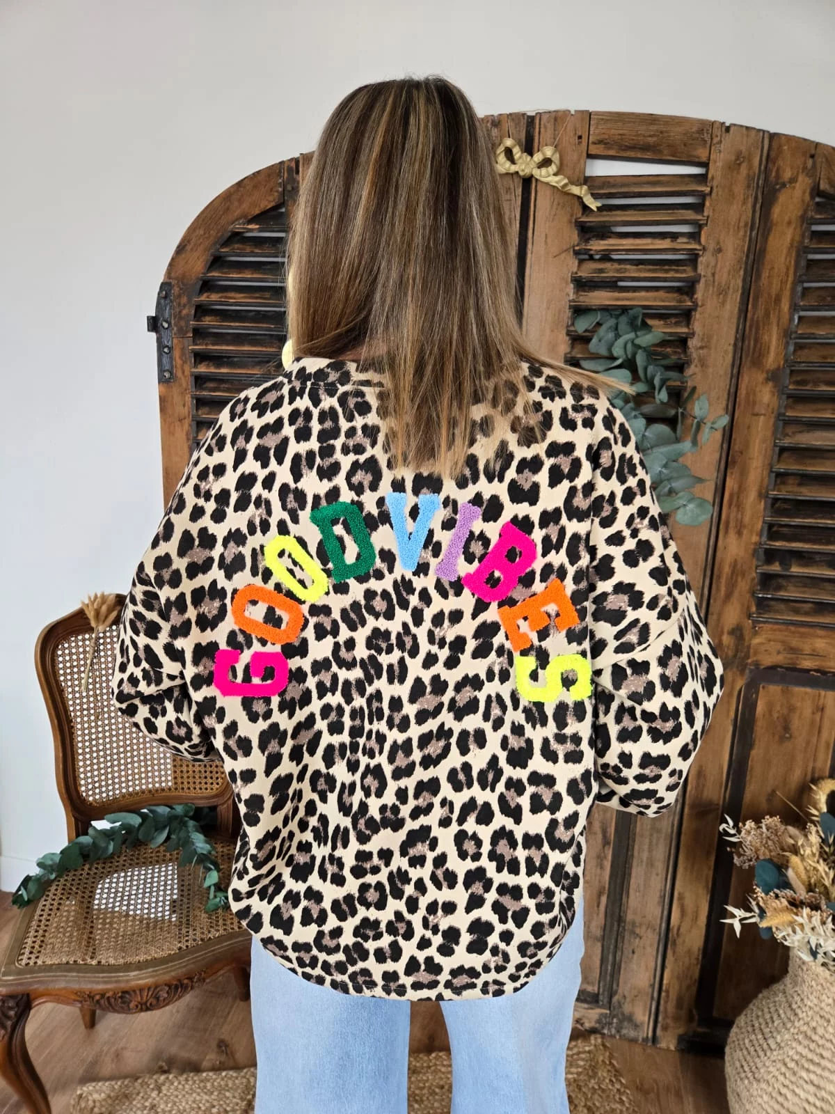 Sweat leopard beige GOOD VIBES au dos