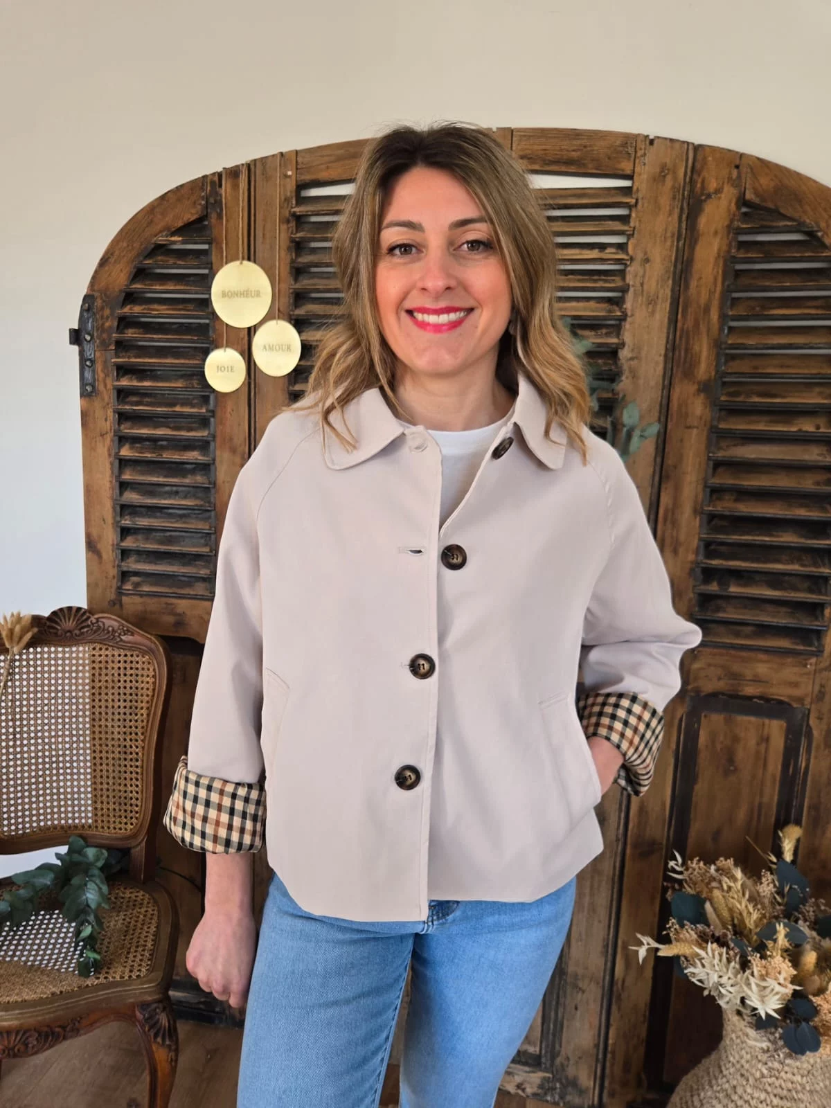 Veste beige Elisa revers ecossais